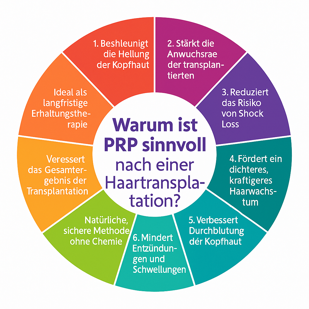 Auch nach der Heilungsphase kann PRP helfen, bestehende Haare zu stärken und weiteren Haarausfall zu reduzieren – besonders wichtig, da nicht-transplantierte Bereiche weiterhin ausdünnen können.